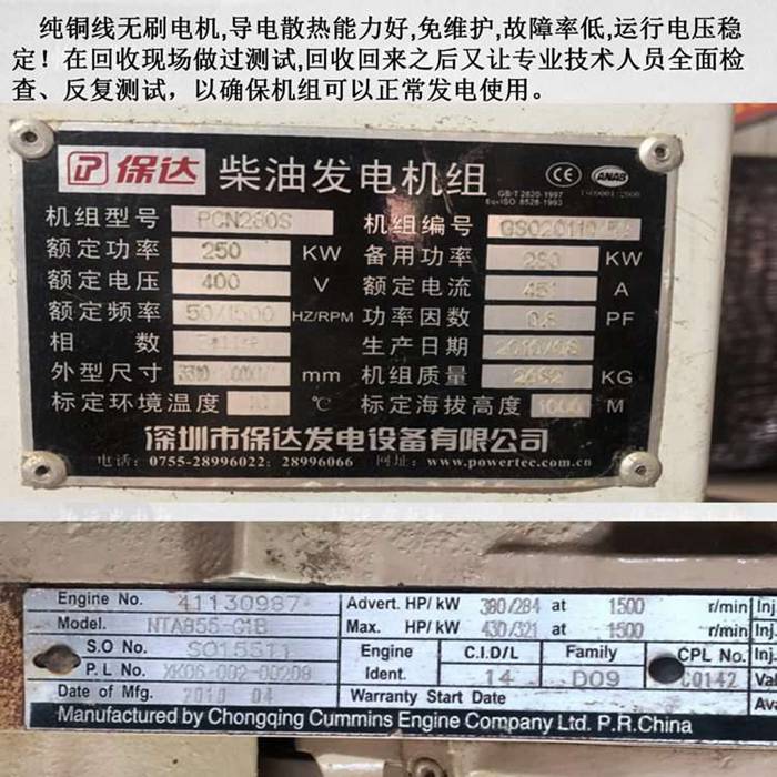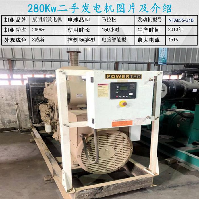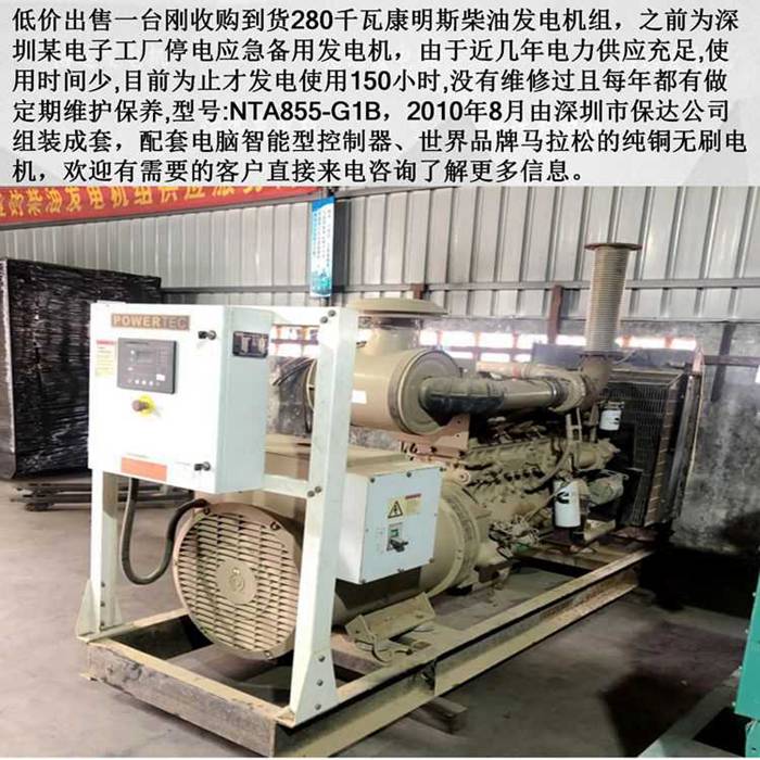 低價出售一臺公司剛新收購到貨二手康明斯280千瓦柴油發(fā)電機組,之前為深圳某電子工廠停電應急備用發(fā)電機組,由于近幾年電力供應充足,發(fā)電使用時間少,目前為止才發(fā)電使用150小時,機器無維修過每年都有做定期的維護保養(yǎng),型號:NTA855-G1B,2010年8月由深圳市保達發(fā)電設(shè)備公司組裝成套生產(chǎn),配套電腦智能型四保護控制器、世界品牌馬拉松的純銅無刷電機,歡迎有需要的客戶直接來電咨詢了解更多信息。