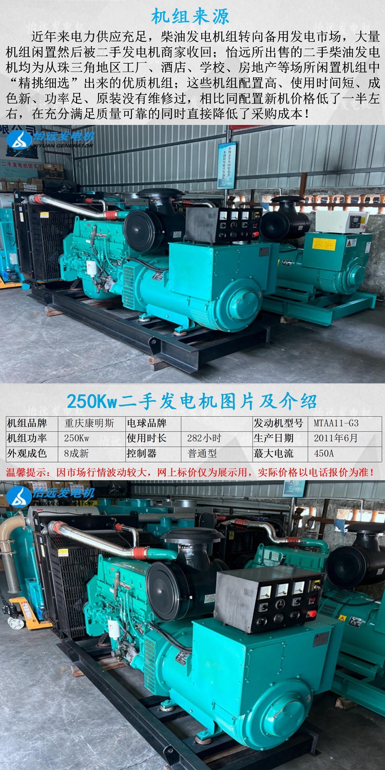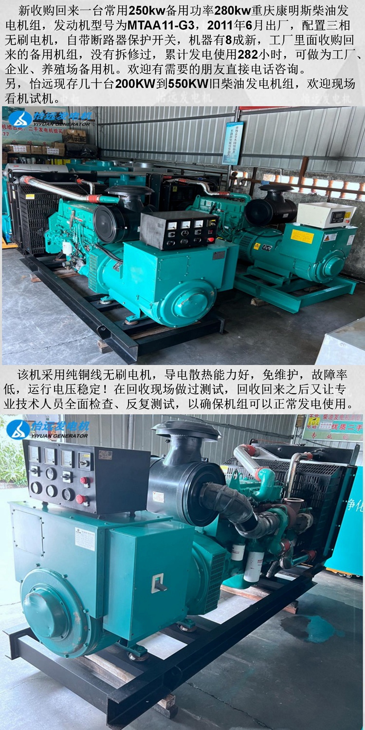 新收購回來一臺二手250kw 康明斯柴油發(fā)電機組, 常用250kw備用功率280kw,發(fā)動機型號為MTAA11-G3,2011年6月出廠,配置三相無刷電機,自帶斷路器保護開關(guān),機器有8成新,工廠里面收購回
