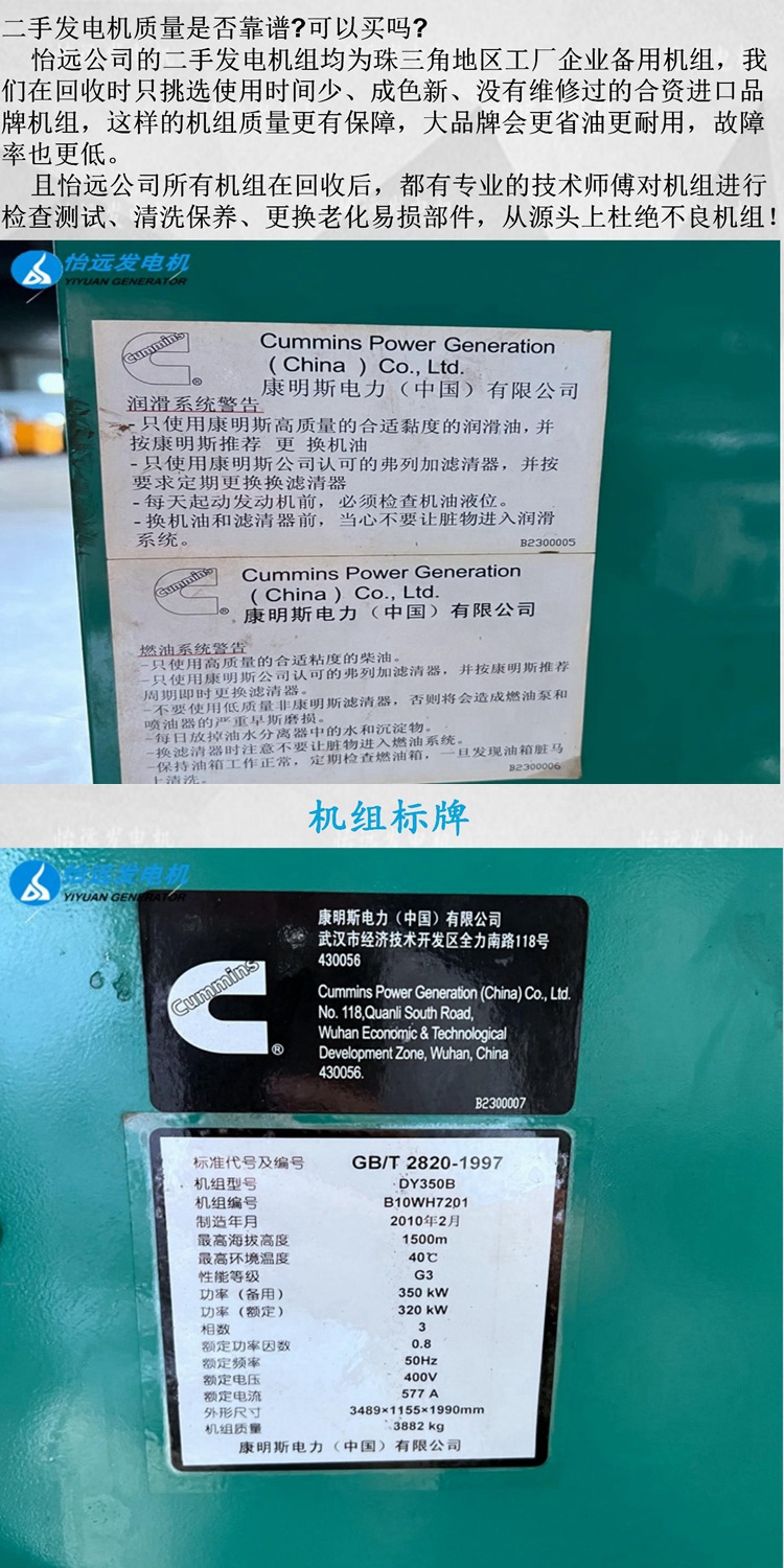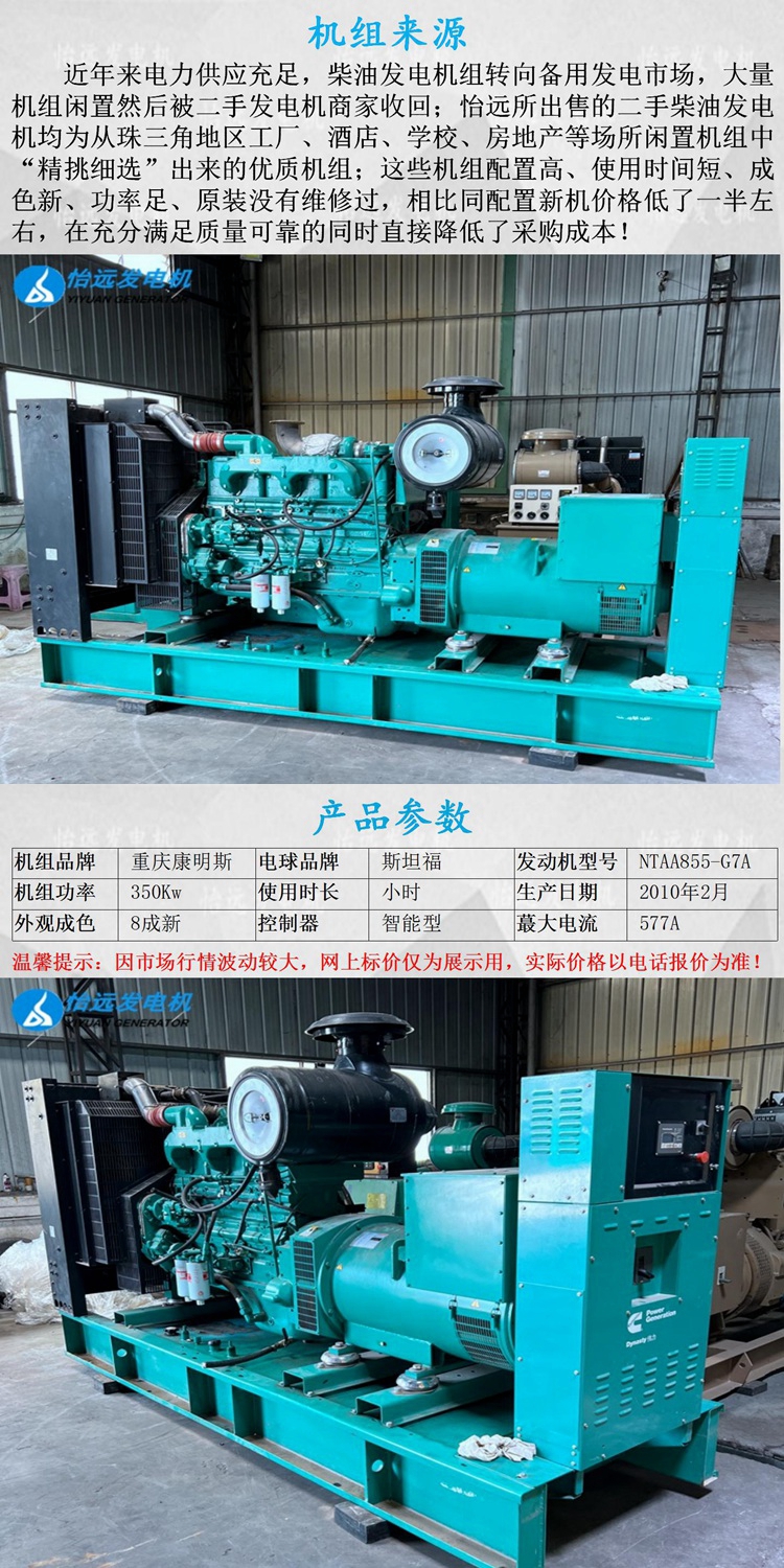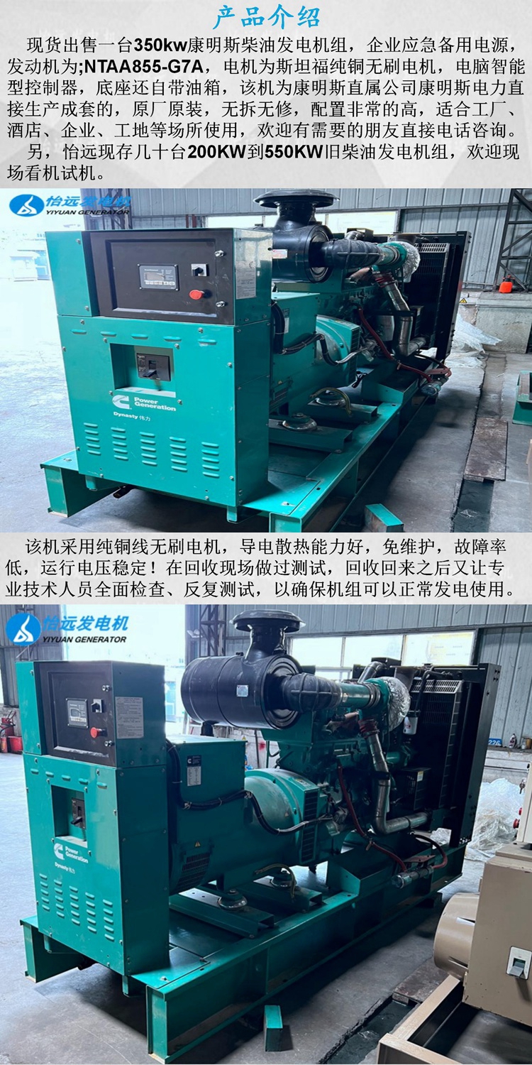 現(xiàn)貨出售一臺二手350kw康明斯柴油發(fā)電機組,企業(yè)應(yīng)急備用電源,發(fā)動機為;NTAA855-G7A,電機為斯坦福純銅無刷電機,電腦智能型控制器,底座還自帶油箱,該機為康明斯直屬公司康明斯電力直接生產(chǎn)成套的,原廠原裝,無拆無修,配置非常的高,目前為止僅運行使用52小時,適合工廠、酒店、企業(yè)、工地等場所使用,歡迎有需要的朋友直接電話咨詢:137 5121 3841