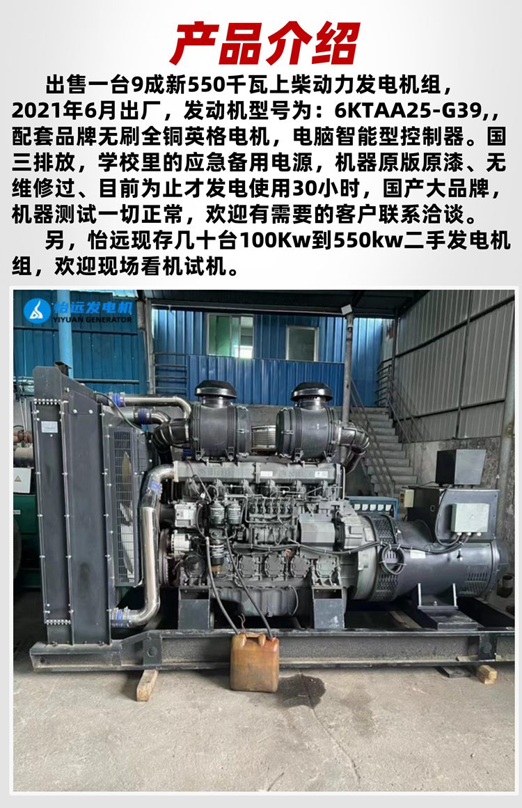出售一臺9成新二手550千瓦上柴動力發(fā)電機組,2021年6月出廠,發(fā)動機型號為:6KTAA25-G39,,配套品牌無刷全銅英格電機,電腦智能型控制器。國三排放,學(xué)校里的應(yīng)急備用電源,機器原版