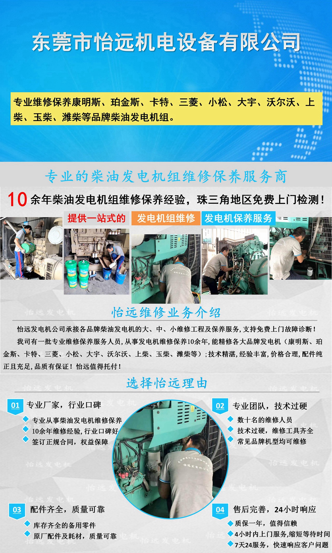 怡遠(yuǎn)發(fā)電機公司提供 東莞發(fā)電機故障檢測 服務(wù),如果您的發(fā)電機出現(xiàn)故障,如果您的發(fā)電機需要維修保養(yǎng),都可以直接聯(lián)系怡遠(yuǎn)公司。我們提供免費上門檢測服務(wù),不管您是東莞城區(qū)